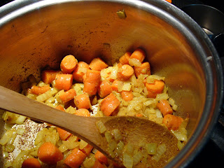 In a large sauce pan, saute the onion in butter. When the onion begins to soften, add the curry powder, salt, ginger and pepper and carrots. Saute until the onions are soft. Don't worry if the curry powder is browning and sticking to the bottom of the pan.